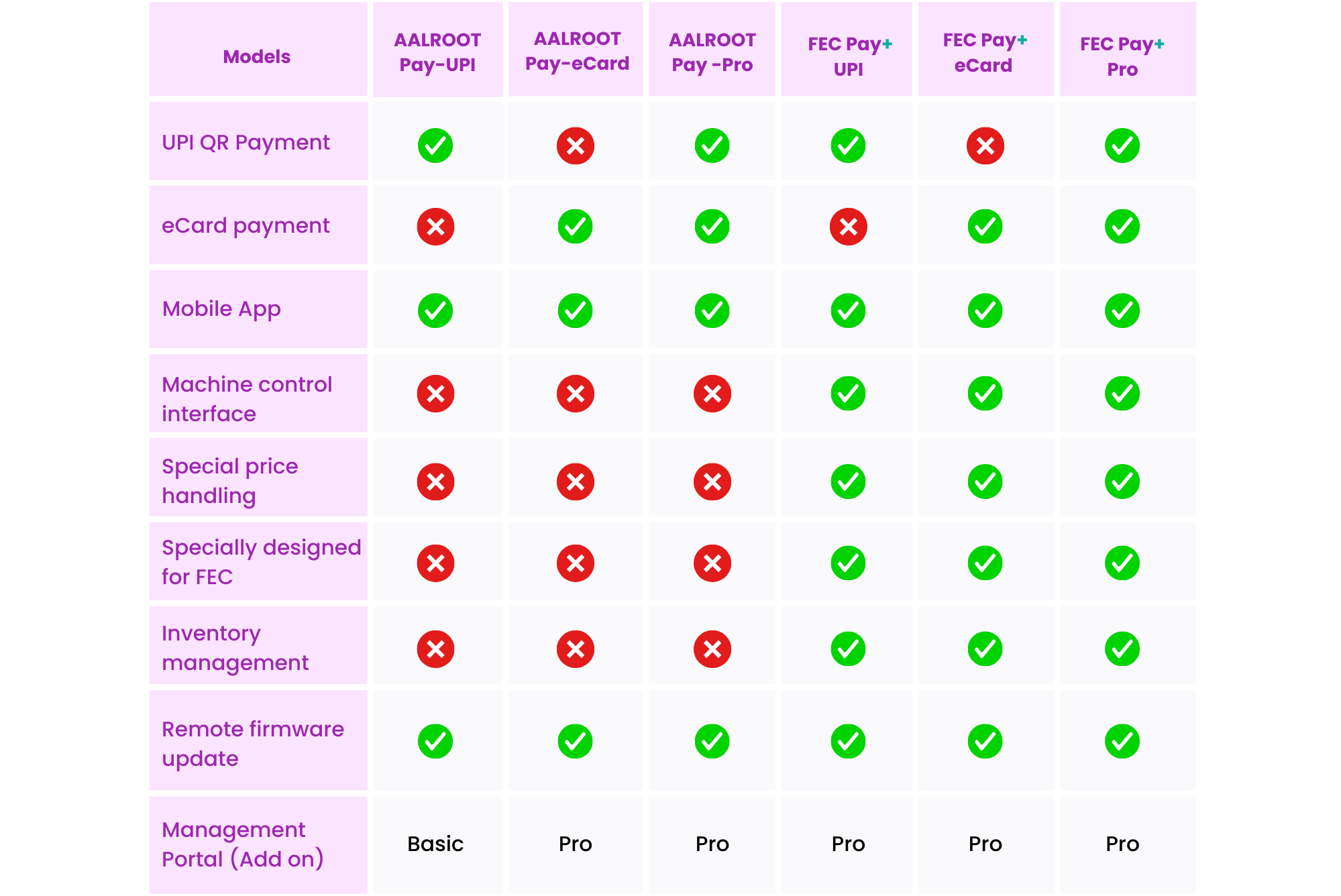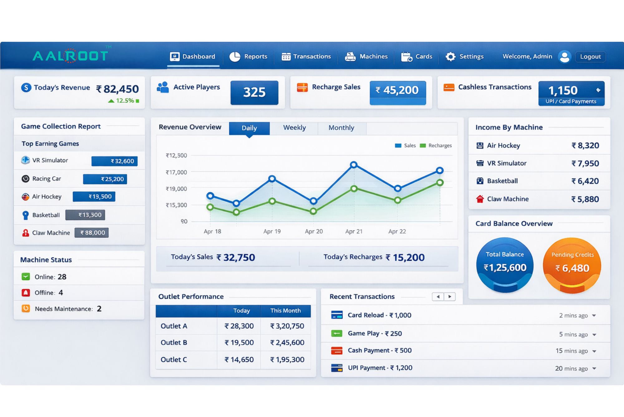 An all-in-one IoT-based cashless automation solution for FECs. AALROOT Pay is the secure digital payment solution supporting UPI-QR and eCard transactions, while FEC Pay+, the flagship platform, delivers advanced FEC-specificcapabilities. FEC Pay+ provides seamless machine control, dynamic pricing, scheduled operations, real-time transaction tracking, remote management, and centralized revenue analytics—ensuring secure payments and complete operational control across arcades and entertainment venues.